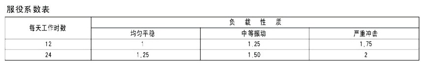 用戶可根據實際工作制和負載性質參照服役系數表,選取服役系數.計算后確定減速電動機的功率與型號。